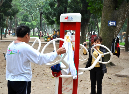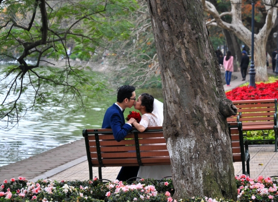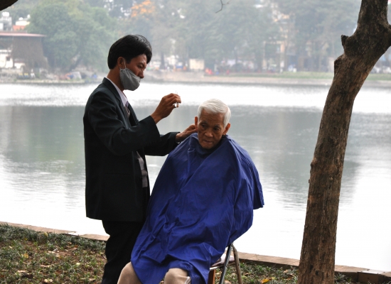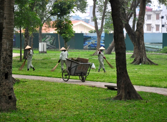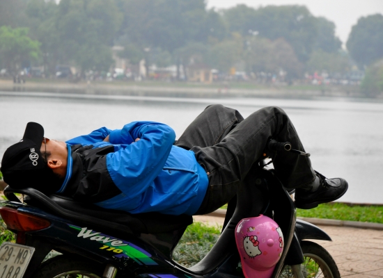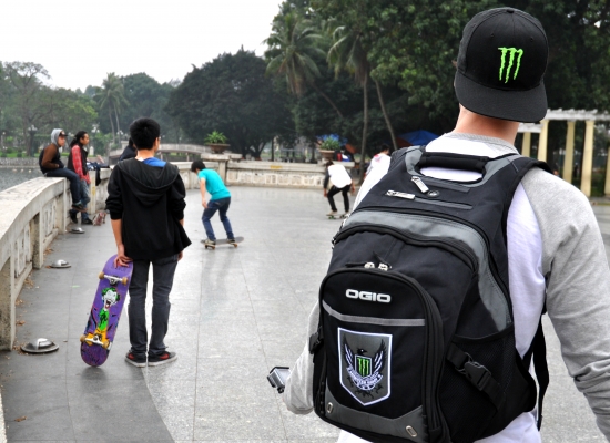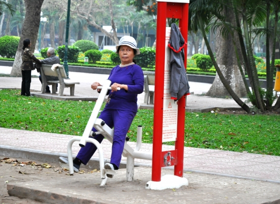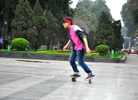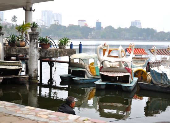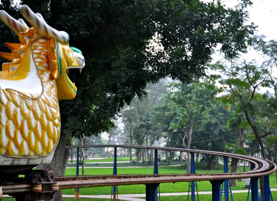 Jsem z toho všeho unavená, tak dáváme pauzu na kafe. Klasický Cà Phê Sữa đá vyřeší každej problém a hlavně nám dodává chybějící energii. Koukáme znova na mapu Hanoje a všímáme si nějakýho obrovskýho parku s jezerem. Ještě jsme tam nebyli, máme milion času, tak proč ne. Pěšky je to celkem dálka a já začínam bejt dost ušmajdaná. Každopádně po půl hodině stojíme před bránou s nápisem Lenin park a nevíme, co máme čekat. U brány se vybírá vstupný čtyři tisíce dongů za osobu, tak to platíme a jdeme tam. Vzhledem k tomu, že si s Adamem moc nečteme a neprohlžíme dopředu info o tom, co to má bejt, nestačíme se pak divit (třeba s tim šílenym mostem, že jo). Vcházíme do prostoru, kde nás hned na začátku vítá strašidelná polorozpadlá atrakce a k tomu psycho hudba jak z nějakýho strašidelnýho filmu. Jdeme dál. Čím dál jdeme, tím to vypadá líp. Zjišťujeme, že tenhle park je taková relaxační a sportovní oáza pro všechny. Lidi sem chodí běhat, cvičit, procházet se nebo skejtovat. Zastavujeme se u několika posilovacích strojů, který jsou určený pro každýho, kdo jde kolem. Tady na nich cvičí především starý lidi a my nedokážem zastavit smích. Je to absolutně skvělý, prej je to i u nás v Čechách, ale já to nikdy neviděla a teď na tom vidim cvičit malý Vietnamce. Nejsou to prostě normální stroje, jsou to různý kola a houpačky a já nevim co všechno. Točíme to, fotíme to a jdeme dál. Tam je to zas dost strašidelný. Rozpadlá stará horská dráha s dračíma vozejkama, která už dávno nejzdí, fůrt hraje ta divná hudba a kolem celýho parku vedou nějaký malý koleje, po kterejch nic nejezdí. Přicházíme k obrovskýmu jezeru, kde se půjčujou lodičky. Na vodě je ale jenom jedna, asi kvůli počasí. Fouká a je pod mrakem. Sedíme a pozorujeme vedle nás na plácku skupinku mladejch skejťáků, jak jezděj. Adam si to jako správnej skejťák samozřejmě fotí a točí na GoPro a všichni jsou z toho tam nadšený. Najednou jezděj jako kdyby o něco soutěžili a předháněj se, kdo dá lepší trik, což je sranda. Po hodině nic nedělání jdeme projít zbytek parku a jdeme směrem na nádraží. Sice máme ještě něco přes tři hodiny čas, ale už tu fakt nemáme co dělat. Sedáme si do kavárny Highlands Coffee před nádražím, objednáváme si další kafe a Bánh Mí a dohromady platíme asi sto tisíc dongů. Kafe mi chutná, Bánh Mí ne. Je tu wifi, zásuvky a maj pohodlný křesla. Já dopisuju deník a Adam střídavě přetahuje fotky na Dropbox, dobíjí elektroniku a čte si. Takhle nějak tam trávíme asi dvě a půl hodiny před odjezdem.