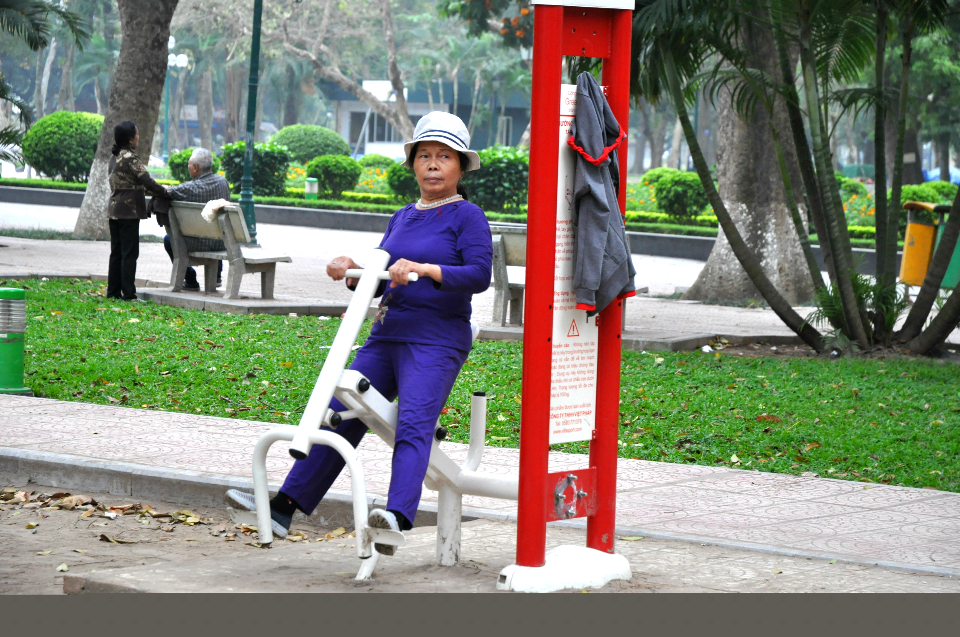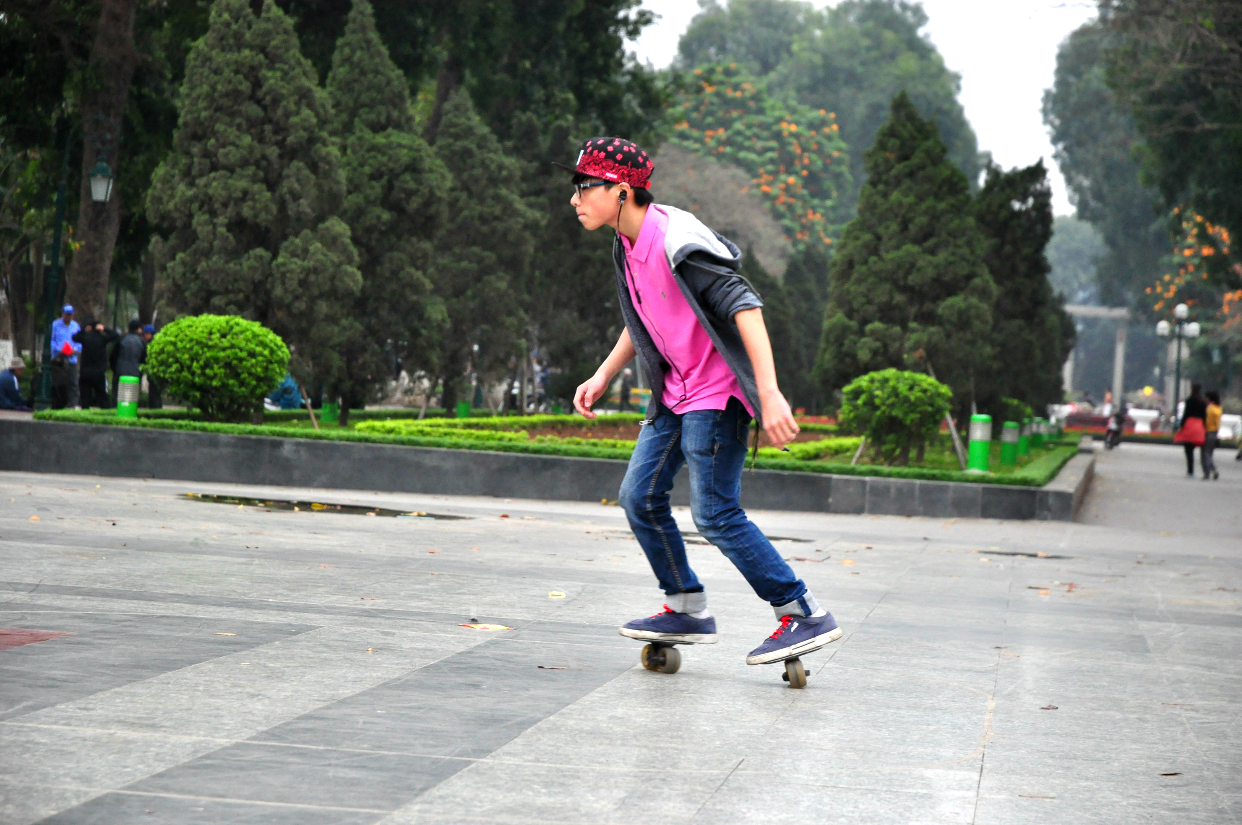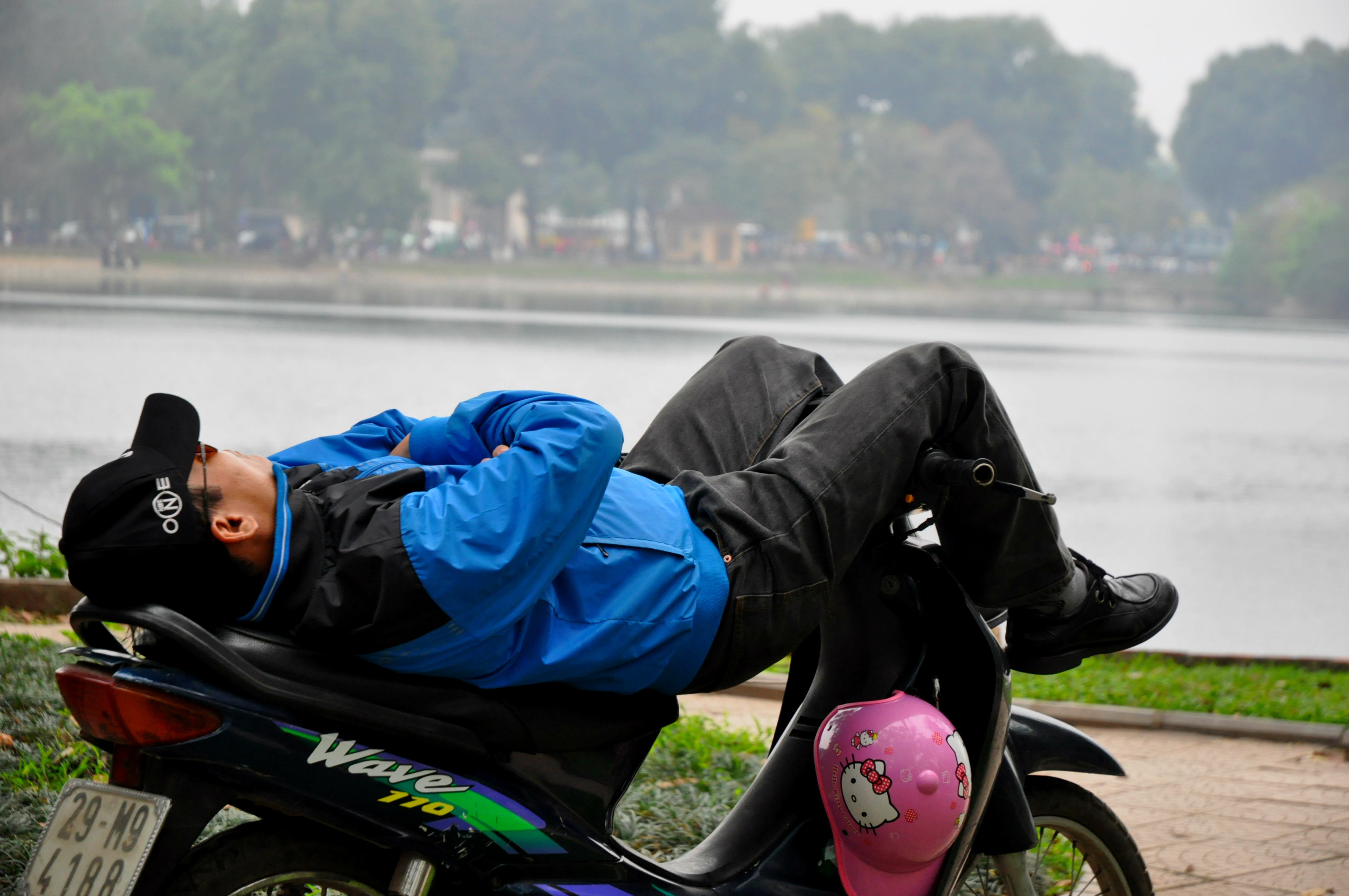 Jsem z toho všeho unavená, tak dáváme pauzu na kafe. Klasický Cà Phê Sữa đá vyřeší každej problém a hlavně nám dodává chybějící energii. Koukáme znova na mapu Hanoje a všímáme si nějakýho obrovskýho parku s jezerem. Ještě jsme tam nebyli, máme milion času, tak proč ne. Pěšky je to celkem dálka a já začínam bejt dost ušmajdaná. Každopádně po půl hodině stojíme před bránou s nápisem Lenin park a nevíme, co máme čekat. U brány se vybírá vstupný čtyři tisíce dongů za osobu, tak to platíme a jdeme tam. Vzhledem k tomu, že si s Adamem moc nečteme a neprohlžíme dopředu info o tom, co to má bejt, nestačíme se pak divit (třeba s tim šílenym mostem, že jo). Vcházíme do prostoru, kde nás hned na začátku vítá strašidelná polorozpadlá atrakce a k tomu psycho hudba jak z nějakýho strašidelnýho filmu. Jdeme dál. Čím dál jdeme, tím to vypadá líp. Zjišťujeme, že tenhle park je taková relaxační a sportovní oáza pro všechny. Lidi sem chodí běhat, cvičit, procházet se nebo skejtovat. Zastavujeme se u několika posilovacích strojů, který jsou určený pro každýho, kdo jde kolem. Tady na nich cvičí především starý lidi a my nedokážem zastavit smích. Je to absolutně skvělý, prej je to i u nás v Čechách, ale já to nikdy neviděla a teď na tom vidim cvičit malý Vietnamce. Nejsou to prostě normální stroje, jsou to různý kola a houpačky a já nevim co všechno. Točíme to, fotíme to a jdeme dál. Tam je to zas dost strašidelný. Rozpadlá stará horská dráha s dračíma vozejkama, která už dávno nejzdí, fůrt hraje ta divná hudba a kolem celýho parku vedou nějaký malý koleje, po kterejch nic nejezdí. Přicházíme k obrovskýmu jezeru, kde se půjčujou lodičky. Na vodě je ale jenom jedna, asi kvůli počasí. Fouká a je pod mrakem. Sedíme a pozorujeme vedle nás na plácku skupinku mladejch skejťáků, jak jezděj. Adam si to jako správnej skejťák samozřejmě fotí a točí na GoPro a všichni jsou z toho tam nadšený. Najednou jezděj jako kdyby o něco soutěžili a předháněj se, kdo dá lepší trik, což je sranda. Po hodině nic nedělání jdeme projít zbytek parku a jdeme směrem na nádraží. Sice máme ještě něco přes tři hodiny čas, ale už tu fakt nemáme co dělat. Sedáme si do kavárny Highlands Coffee před nádražím, objednáváme si další kafe a Bánh Mí a dohromady platíme asi sto tisíc dongů. Kafe mi chutná, Bánh Mí ne. Je tu wifi, zásuvky a maj pohodlný křesla. Já dopisuju deník a Adam střídavě přetahuje fotky na Dropbox, dobíjí elektroniku a čte si. Takhle nějak tam trávíme asi dvě a půl hodiny před odjezdem.