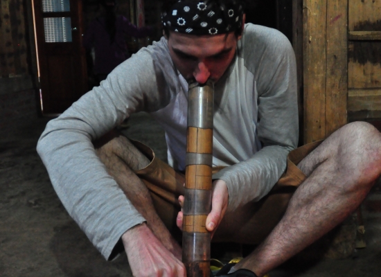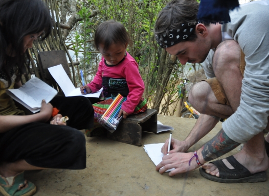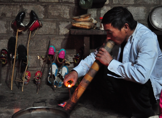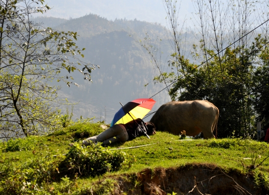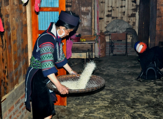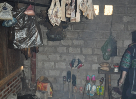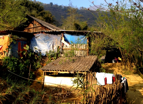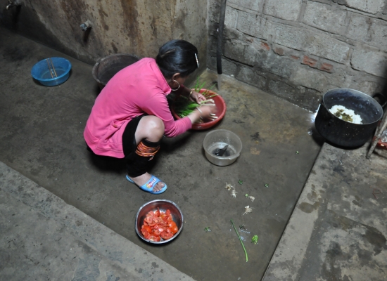 Po večeři probíhá koupání dětí. Voda se ohřejvá na ohni a pak se míchá teplá voda se studenou. Dospělí se nemejou. Prej se mejou jednou za tejden, někdy jednou za čtrnáct dní. Děti umejvaj tak, že jim vyhrnou rukávy a nohavice, na kartáč nasypou stejnej přípravek, jakoym mejou nádobí a začnou jim tim drhnout ruce a nohy. Pak přípravek opláchnou a tím je hygiena hotová. Všichni si pak večer čistíme zuby na místě, kde se před chvíli umejval o nádobí a děti. Děti jdou spát a my sedíme ještě u ohně s Tu a manželem jeho sestry. Ptáme se, kde se naučila anglicky a ona nám vysvětluje, že z odposlechu turistů. Prej neumí číst ani psát (a to ani ve svym jazyce), ale dorozumí se. Přijde nám to neskutečný. Pak nám nabízej, abysme si pokouřili z jejich dýmky. Ona to neni teda moc dýmka, ale spíš bong. Já odmítam, ale Adam se samozřejmě na tohle nenechá dlouho přemlouvat. Nejdřív zkouší místní tabák, pak zkouší i místní marihuanu. Nemá to prej ale tu sílu, jako u nás. Chvíli si ještě povídáme, pak si dáváme výlet na seno a konečně se přesouváme do naší „ložnice“. Je zima, takže oblečení ani nesundavám a beru na sebe ještě bundu. Adam se taky ještě oblíká. Než vlezeme do postele, probíhá takovej vnitřní souboj. Už takhle si připadáme neskutečně špinavý, když jsme se dva dny neměli kde umejt a teď máme vlízt do špinavejch peřin, plnejch havěti. Navíc se tam střídaj různý lidi a pochybuju, že to nějak perou. Zhejčkanost dáváme ale stranou a lezeme tam. Ještě, že je taková tma a nevidim pořádně, co kolem mě je. To bych nemusela zvládnout totiž. Snažíme se s Adamem ještě v tichosti probrat naše dojmy z dnešního dlouhýho dne. Rozpadlej autobus, půjčení motorky, mlha, nádherný terasy, špinavý děti , prasečí vnitřnosti a podobně. Než to všechno stihneme probrat, oba dva usínáme. Máme za sebou fakt náročnej den a zejtra na odpočinek taky nebude čas.