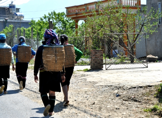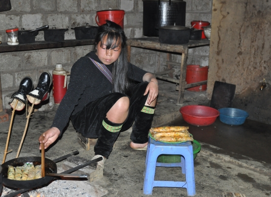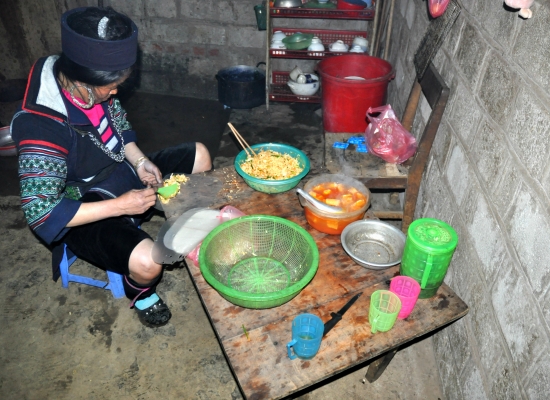 Kolem čtvrtý se vracíme do Sapy na náměstí a řešíme, jak se dostat k Tu. Sice nám řekla jméno vesnice, kde bydlí, ale víc nevíme. Nezbejvá, než jí zavolat. Já mám v mobilu ale vietnamskou simku, která mi dovolí používat jenom internetový data a Adam má zase českou simku, ze který takovej hovor bude stát neskutečnej balík. Chvíli chodíme po náměstí a pak potkáváme kluka, co nám půjčil motorku. Po chvíli vysvětlování rukama nohama (neumí tam moc anglicky) pochopil, že chceme půjčit jeho mobil, aby jsme si mohli zavolat. Vytáčí nám číslo a Tu to hned zvedá. Ptám se jí, jak se k ní dostaneme. Shodou okolností prej jede za půl hodiny znova na náměstí, takže tam máme počkat. Týpkovi vracim mobil, dávám mu pět tisíc dongů za ochotu a jdeme si sednout na lavičku. Za půl hodiny fakt přichází Tu, v ruce má tašku s nákupem z truhu a ukazuje, že máme jet za ní. Ona si sedá na motorku, kterou řídí její manžel a vyrážíme směr Lao Chai. Neni uplně jednoduchý s něma držet krok, protože maj Sapu dost projetou a některý kličky, co tam předváděj, nemáme šanci napodobit. Každou chvíli tak na nás čekaj. Jsou fakt nejvíc hodný. V polovině cesty musíme zaplati poplatek padesát tisíc dongů na osobu za vjezd do údolí. Proč se zrovna za tohle údolí platí, chápeme hned za pár minut. Tu nám ukazuje ty nejkrásnější výhlídky z celé Sapy a my konečně vidíme to, kvůli čemu sem jezdí lidi z celýho světa. Párkrát nám zastavujou i na fotku a my nemáme slov. Jestli to, co jsme doteď viděli, bylo krásný, tak tohle je supr ultra nádherný. Po pár nádhernejch zastávkách přijíždíme do vesnice Lao Chai. Je to vesnice, kde žije etnická minorita Hmongů. V Sapě se nejčastěji setkáte právě s Hmongy nebo ještě minoritou Red Dao. Poznáte je od sebe na první pohled, protože Hmongové nosí křiklavě barevný oblečení a Red Dao maj vyholený vlasy a maj na hlavě červený šátky. My jsme se rozhodli poznat spíš Hmongy, protože mě upřímně ty vyholený hlavy dost děsily. Přijíždíme prašnou cestou k malýmu domečku, kterej je celej ze dřevěnejch prken a nahoře jsou hozený nějaký plachty. Domek je postavenej přímo nad nádhernym výhledem na rejžový terasy a je hned vedle místní školy. Parkujeme motorku a Tu nás seznamuje s její rodinou. Tím pro nás začíná největší nával emocí za celou cestu. Tu nám představuje její dvě děti, dvě děti její sestry, manžela, manžela sestry, dědečka, babičku a ještě nějakou sestřenici. Jména si absolutně nepamatuju a jsem totálně v šoku. Děti nemaj boty, maj na sobě totálně špinavý oblečení a některý z nich maj celej obličej od nudlí z nosu. Děti pobíhaj na prašnym plácku před barákem mezi slepicema, kočkama, psem a dalšíma zvířatama. Ta nejmenší holčička má papír, pastelky a něco si čmárá. Tipuju, že to dostala od nějakejch turistů. Pak vcházíme dovnitř. Jsou tu tři místnosti, ale nejsou ani oddělený dvěřma, jenom příčkama. Je tu betonová zem a jedna cihlová stěna, což znamená, že jsou to trošku bohatší Hmongové. U chudších rodin cihlová zeď neexistuje. V jedný místnosti se spí, ve druhý je stůl a žídle a ve třetí se vaří a umejvá. Nad velkou částí celýho domku je půda, kde maj jenom zásoby rejže, kterou vypěstovali. Tu nás vede do místnosti, kde budem spát a ukazuje nám postel. Ta je neskutečně špinavá, vypadá že v ní žijou brouci a visí nad ní roztrhaná a špinavá moskytiéra. Skládá se z několika různejch kusů matrací, na kterejch jsou různě naházený peřiny. Házíme si tam věci a jdeme rychle pryč. Házíme na sebe s Adamem „to je teda síla“ pohledy a pokračujeme v prohlídce. V další místnosti je stůl, několik židlí a malá stará přenosná televize. Upřímně bych tady žádnou televizi nečekala, ale asi kvůli dětem našetřili. Ve Vietnamu má totiž skoro každej po ruce aspoň malou televizi. V největší místnosti je kuchyň, koupelna a obývák v jednom. Vaří se tady na ohni, přes kterej jsou natažený dvě kovový tyče. Na tyčích jsou tři hrnce a v těch se ohřívá voda nebo vaří jídlo. Koupelnou myslim hadici, do který teče voda z hor. Voda pak vytejká malou dírou v domě zpátky do přírody. Tuhle hadici používaj k mytí nohou, nádobí, zubů i zeleniny. Záchod tady nemaj a choděj ven na seno. Neni tam ani žádná díra do země. Prostě jenom seno. Kolem baráku všude něco pěstujou a chovaj. Běhaj tu zvířata a maj tady banány, čaj, rejži a třeba i marihuanu, kterou používaj k výrobě oblečení. Oblečení pak i sami barví do typickejch hmongskejch barev v obřích kádích za barákem. Jsem ze všeho totálně v šoku, dělám pár fotek, sedám si k ohni a pozoruju, jak se nám připravuje večeře. Nejdřív se dá v jednom hrnci vařit rejže. Žádná sůl, prostě jenom rejže a voda. Pak se postupně připravuje tofu s rajčatama, závitky, mladá brokolice, cibulka s houbama, krájí se špek a smaží se prasečí vnitřnosti. Všimla jsem si, že nepoužívaj vůbec žádnou sůl ani koření. Několikrát nabízíme pomoc, ale nikdy ji nepřijmou.