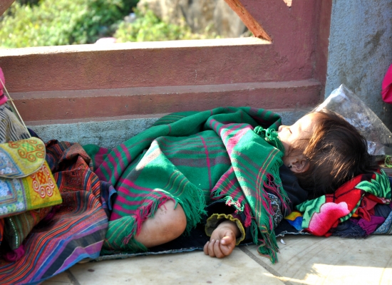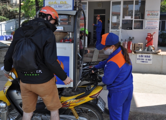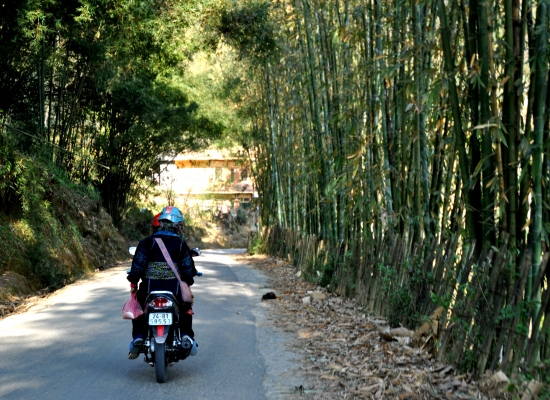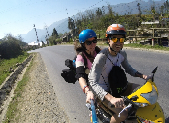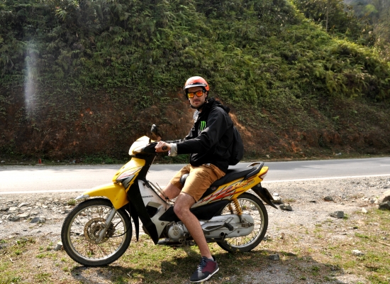 Po třech hodinách od nástupu do minibusu jsme konečně v Sapě. Platíme vysmátejm Vietnamcům šedesát tisíc dongů a vystupujeme. V tu chvíli se na nás opět sesypou různý taxikáři a lidi, co nabízí motorky nebo ubytování. Všechno odmítáme a snažíme se tady trošku rozkoukat. Sedáme si na nějakej nejbližší kámen a přemejšlíme, jak to uděláme. Po chvíli přemejšlení za náma přichází malá roztomilá paní s křiklavě růžovym šátkem na hlavě a ptá se nás, jestli bysme nechtěli přespat u ní doma. Vzhledem k tomu, že neni votravná jak ostatní, ptáme se jí na podrobnosti. Nabízí nám homestay, ve kterym bysme byli jenom my dva a její rodina a k tomu trekking po Sapě. My dva nejsme teda rozhodně typy na dlouhý procházky mezi rejžovejma polema, takže trekking odmítáme a domlouváme si homestay. V Sapě máte totiž několik variant, jak tam strávit čas. První možnost je vzít si klasickej hotel, objednat si tam okružku a mít to všechno zajištěný. Tuhle možnost hned škrtáme, protože je to dost nuda. Druhá možnost je si vzít turistickej homestay, kde je třeba dvanáct turistů a opět si k tomu připlatit program. Tahle možnost sice zní o něco líp, ale nic autentickýho rozhodně neuvidíte. Hromadný turistický homestaye maj totiž záchody i sprchu a to má do reality v Sapě daleko. Navíc je to drahý. Tuhle možnost teda taky škrtáme, protože klasickej lov na turisty nemusíme a chceme zažít něco autentickýho. Třetí možnost je vzít si autentickej homestay, půjčit si motorku a zažít Sapu tak, jak ji vidí málokdo. Ono vlastně základem je půjčit si tu motorku. To autentický bydlení už je jenom taková třešnička na dortu. Bez tý motorky se totiž dostanete jenom na nejturističtější místa, který před váma vidělo už asi milion lidí. Maličká paní (z etnické minority Hmong) se nám představuje jako Tu a domlouvá s náma sraz na večer. Taky s náma rovnou dohaduje cenu čtyři sta tisíc dongů za jednu noc pro dva s večeří i se snídaní. To mi přijde uplně super. Dává nám číslo, říká jméno vesnice, ve který bydlí a ptá se nás, jak se tam dostaneme. Říkáme, že si chceme půjčit motorku, ale nevíme kde. Na chvíli odbíhá a za minutu se vrací s nějakym klukem na motorce. Ten nám prej půjčí motorku. Říkáme mu teda, že bysme chtěli motorku na dnešek a zítřek. V tu chvíli sleze z tý motorky, dá nám klíčky a říká, že to bude tři sta tisíc dongů. Kroutím hlavou a říkám, že to chci za dvě stě tisíc dongů. Chvíli si tam něco mumlá vietnamsky, ale nakonec souhlasí. Berem motorku, dvě helmy, klíčky a domluva zní, že zejtra v pět na tomhle místě mu motorku vrátíme. Pro jistotu si chlapce fotím, protože mi přijdou všichni stejný a nemusela bych ho poznat. Loučíme se s Tu, startujeme motorku a vyrážíme k první benzínce. Jsme uplně v šoku, jak to tady funguje a musíme se smát. Člověk by čekal, že ho chlapec doveze někam do půjčovny, ale ne. Tady se s nějakym papírovánim netrápí a místo toho vám daj klíčky od motorky rovnou do ruky a řeknou, že zejtra v pět jim máte motorku vrátit. Na benzínce si necháme natankovat plnou nádrž a platíme něco kolem dvaceti tisíc dongů. Litr tady stojí asi třináct tisíc dongů, což je skoro zadarmo a vy na dva litry můžete jezdit skoro dva dny v kuse.