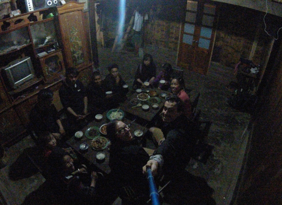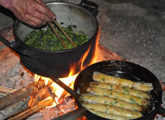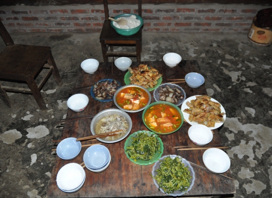 Ve chvíli, kdy je všechno uvařený, se jídlo rozmístí na několik různejch talířků, aby každej měl po ruce všechno. Každej taky dostane před sebe mističku a hůlky a přichází chvíle na modlení. Hmongové jsou křesťani a tenhle zvyk opakujou před každym jídlem. Po modlitbě se na každou mističku nandá rejže, ta se zaleje vývyrem a pak si každej do mističky dává, co chce. Nám tam dávaj na začátek od každýho něco. Závitky jsou super, ale tím ta super chuť pro mě končí. Ostatní jídlo žádnou chuť vlastně nemá, protože to není ničim dochucený. Nejhorší chvíle je sníst prasečí vnitřnosti. Mně nevadí játra, ledvinky a podobný vnitřnosti, ale tohle je něco jinýho. Tohle jsou pupíky, kousky žaludku, srdeční blány a podobně. Všechno to v puse divně křupe a má to na rozdíl od zbytku jídla fakt hodně silnou chuť. Adamovi to třeba ale chutná, takže je to hodně subjektivní. Nejhorší ale je, že když dokřoupu poslední blánu a raduju se, že to mám za sebou, dědeček mi tam s úsměvem do misky hodí další nálož. U nich je totiž zvykem, že když maj hosty, tak jim prostě fůrt přidávaj. A jelikož je prostě urazit nechci, tak se snažim jíst do posledního sousta. Adam třeba dostává už čtvrtou porci špeku a taky už mu to evidentně leze ušima. Taky mam třeba dost problém s těma hůlkama. Normálně totiž ta rejže lepí a tím se dá v pohodě nabírat. Tahle rejže je ale taková hodně kulatá a navíc zalitá vývarem. Rejže tim pádem u sebe vůbec nedrží a já pokaždý naberu tak dvě zrníčka. Všem u stolu to příjde děsně vtipný, tak se směju taky. Nikdo kromě Tu tady neumí anglicky, takže stejně jinej druh komunikace mezi náma neprobíhá. Po večeři všichni společně sklízíme a těch pár zbytků se dává jako žrádlo pro zvířata. Vietnamci absolutně nic nevyhodí a využijou každou část rostlliny i zvířete.