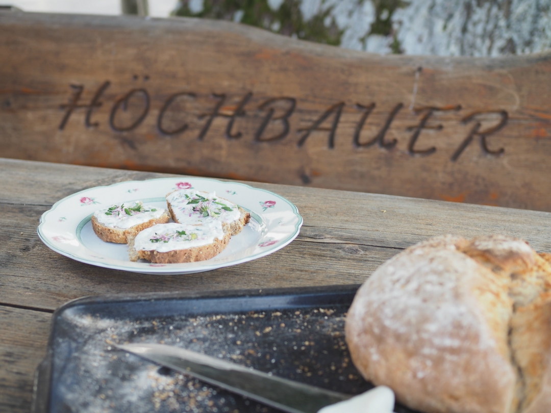 Druhej den ráno jsme přijeli na statek a hned jsme se s Peperl vrhly na pečení chleba. Celej proces totiž trvá asi pět hodin, tak abysme ho stihly upéct do oběda. Snažila jsem se pro vás pochytit přesnej recept, ale Peperl to tam všechno dávala od oka a sama mi říkala, že to dělá podle citu. Takže recept na chleba nemám, ale fotky z přípravy a použitý suroviny jsem přidala do receptu k pomazánce. Zadělaly jsme teda na těsto, pak jsme si všichni různě povídali o tom, co kdo na statku přesně dělá, o historii statku a já s Marthou hlavně o bylinkách. Já teda absolutně neumím německy, takže nám od všech musela tlumočit naše kolegyně Jana, ale jediná Martha umí dobře anglicky, tak jsme se spolu dlouho bavily právě o bylinkách. Bylo to neskutečně zajímavý, protože se v nich perfektně vyzná a je schopná říct, na co jaká třeba i úplně neznámá náhodná bylinka přesně je a podobně. Bylinkovou zahrádku si založila, když začala mateřskou dovolenou, aby měla nějakou činnost. Postupně se to prej rozkřiklo a teď za ní jezdí pro bylinky všichni z okolí. Dělá z nich hlavně čaje, ale přidává je i do pomazánek, solí a vyrabí pro rodinu různý mastičky. Nejlepší na tom je, že používá hlavně divoký bylinky, který můžeme potkat běžně i u nás na loukách. Seděly jsme spolu v trávě a popisovala všechno co viděla kolem sebe. Dozvěděla jsem se že i zdánlivě nepoužitelný listy pro mě absolutně neznámý rostliny jsou třeba dobrý na to, když vás štípne komár. Jiný listy a květy zase na kašel a podobně. Prostě se dá použít skoro všechno, akorát jsem se o to nikdy víc nezajímala. Je to ostuda a musím to rozhodně napravit, protože mě to dost zaujalo hlavně pak u přípravy pomazánky. Kolik úžasnejch a volně dostupnejch bylinek se dá použít jsem ani ve snu netušila.