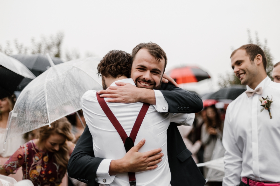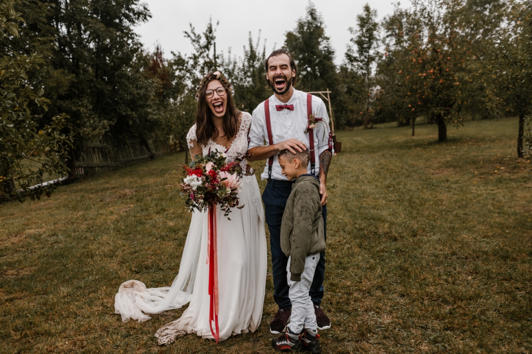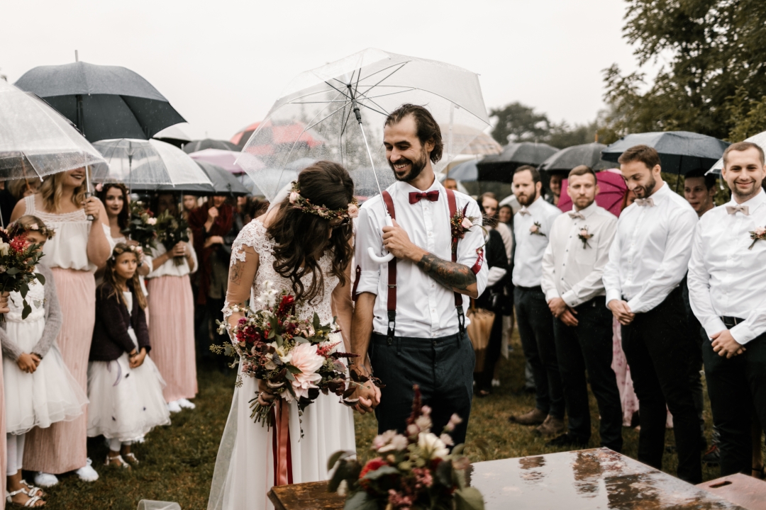 Táta mě vede k “oltáři”, Adélka s Amálkou mi drží závoj a já se nemůžu ubránit největšímu pláči. Tentokrát to jsou ale už slzy štěstí. Vidím totiž, jak se všichni usmívaj a jak na mě Adam odhodlaně čeká v tom dešti bez deštníku. V tu chvíli vím, že je všechno naprosto v pořádku a že to bude skvělý. Táta předává moji ruku Adamovi, říká, že mu dává to nejcennější, co má a od tý chvíle se nepřestávám usmívat. Najednou ze mě všechno padá a začíná obřad. Máme nejlepšího oddávajícího na světě. Nejenom, že Jiří Klepsa odhazuje před začátkem řeči deštník, ale zakomponoval do svýho proslovu navíc naše požadavky a jako bonus dost vtipně. Celej obřad je dost uvolněnej, všichni se smějou, pusu si dáváme dřív než máme a nakonec se mi daří Adamovi dát i ten prstýnek. Původně jsme nechtěli vůbec dělat gratulace, aby jsme zbytečně nebyli na dešti, ale všem to je evidentně jedno, tak to dáváme i v dešti. Terka z Yes&Yes odhodlaně stojí vedle nás naprosto promočená a drží nad náma deštník. Při obřadu ho pro změnu držela nad foťákem Teru. Je neskutečná. Jediný, co přeskakujeme, je skupinový focení, protože všem včetně nás začíná bejt už celkem zima.