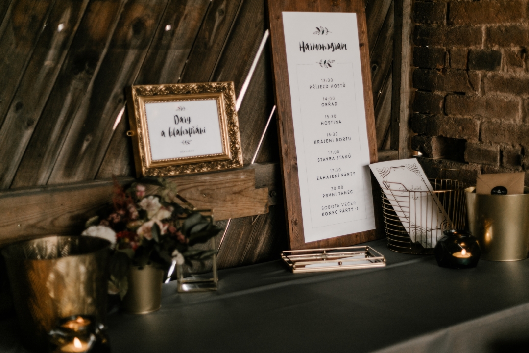 Všechny tyhle věci si vzaly na starost Yesky. Samozřejmě jsme se nejdřív dohodli, jak by to mělo asi tak vypadat, ale opět jsme nechali spíš volnou ruku. Šlo nám hlavně o to, aby to bylo co nejjednodušší (v tom nejlepším slova smyslu), do barev svatby a takový přírodní. Terka je profík přes grafiku, takže nám navrhla v tomhle stylu několik možností a my vybrali přírodní papír v kombinaci se zdobenějším písmem. V tomhle stylu se pak nesla celá svatební grafika. Terka nám udělala nejkrásnější svatební oznámení, logo, svatební newsletter, cedulky pro hosty, kartičky na svatební menu, harmonogram, cedulky do fotokoutku, seznam hostů, nápojovej lístek a pak doplňující texty ke sweet baru a na taneční parket. Děda mi pak na chalupě vyrobil dřevěný cedulky, na který Terka vyrobila nalepovací směrovky parkoviště, obřad a podobně. Dřevo jsme koupili s Adamem někde v Hornbachu nebo Obi, děda to nařezal a máma s tetou dřevo natřely.