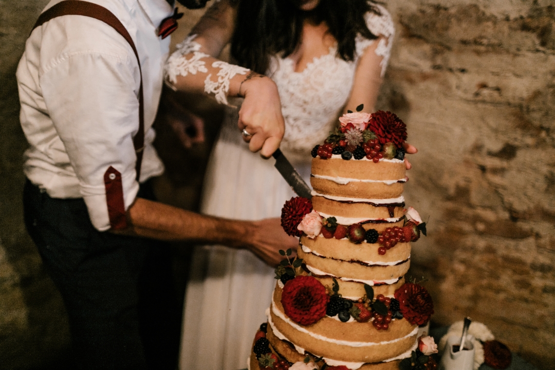 Kromě pořádnýho jídla ale nesměl chybět samozřejmě dort, koláčky, dezerty a dobrý kafe. Co se týče dortu, není úplně jednoduchý těsně před svatební sezónou očekávat volný termíny. Každopádně mě hned napadla Ivča z blogu Cat and Cook. Věděla jsem ale, že je dost pracovně vytížená a navíc do toho má v podobným termínu další svatební dort. Ivča se ale hned nadchla a s největší samozřejmostí nabídku přijala. Přitom sama říkala, že čtyřpatrovej dort nikdy nedělala a bude to pro ni výzva. Představu (jak jinak než tu z Pinterestu) jsem jí ukázala, ale nechala jsem jí, co se týče náplně a všeho kolem, úplně volnou ruku. Myslím, že tak se lidem stejně pracuje nejlíp. Ivča několikrát korpusy zkoušela dopředu o víkendech ve svým volnu a fakt s tím měla dost práce. Dort dopadl ale nejlíp jak mohl a byl přesně takovej, jako jsem si ho vysnila. Vanilkový korpusy, marmeláda, slanej karamel, mascarpone, čerstvý ovoce a spousta kytek.