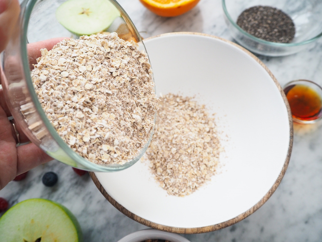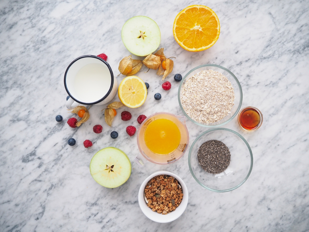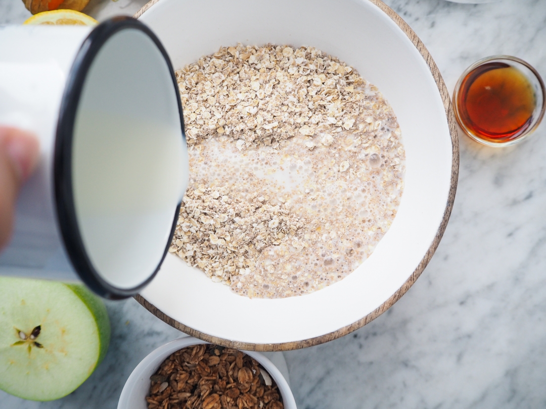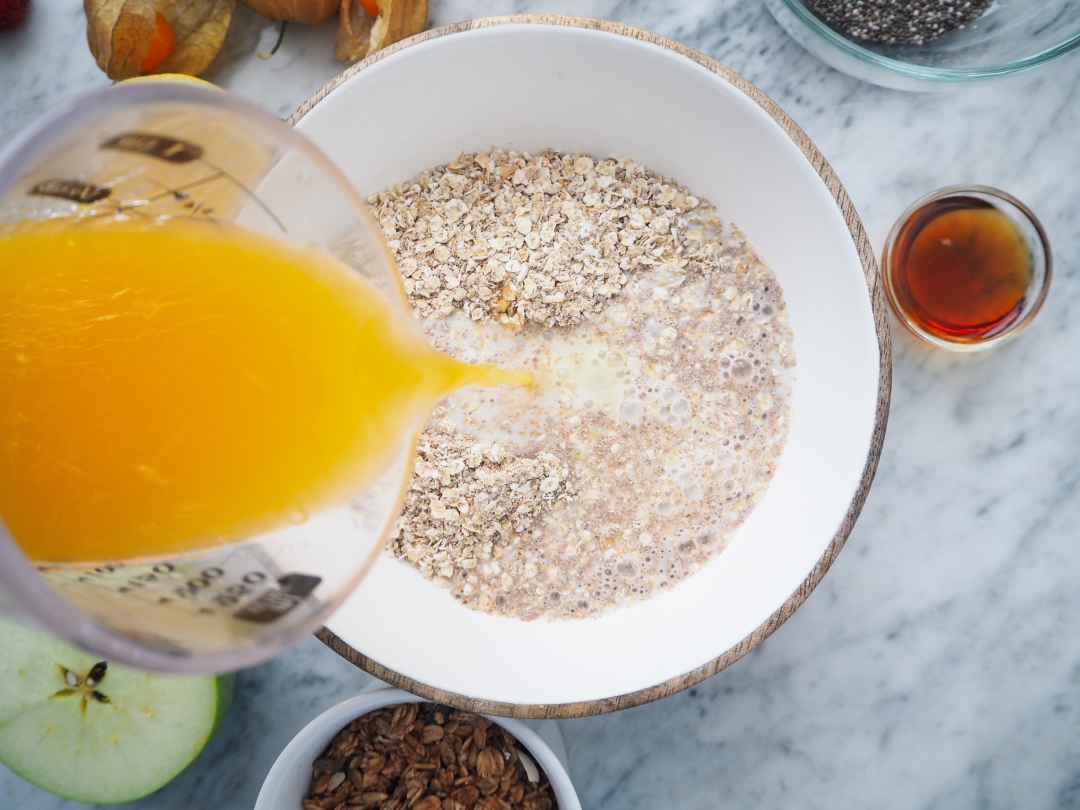 Za tím cizím názvem nehledejte nic složitýho. Je to vlastně ovesná kaše přes noc, kterou si dochucujete podle sebe. Základem je vločky přes noc (nebo prostě tak na 10 hodin) namočit do nějaký tekutiny. Za tu dobu totiž vločky tekutinu nasáknou a vznikne kaše. Vločky se tak nemusí vařit a jsou ještě výživnější. Původní recept je malinko jinej, ale dá se s ním opravdu dobře pracovat a měnit ho. Mně chutná teď hodně verze s pomerančovou šťávou a citrusovou kůrou, ale u mě v kuchařce najdete třeba i verzi s jogurtem a bez citrusů. Na závěr přidávám například granolu, ale můžete použít i oříšky nebo jenom ovoce. Je to čistě na vaší chuti.