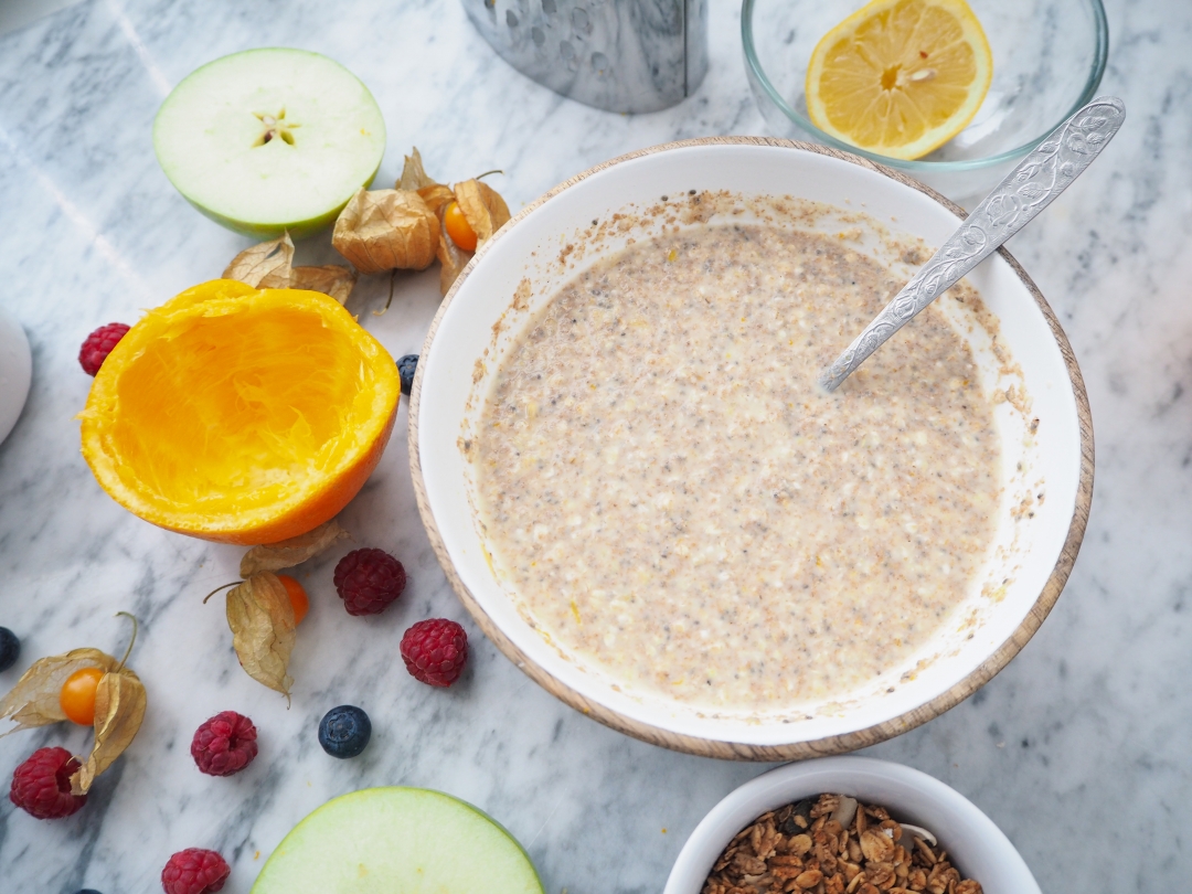 Je to vlastně strašně jednoduchý. V misce jsem smíchala vločky s mlíkem, čerstvou pomerančovou šťávou, citrónovou šťávou, s chia semínkama a javorovým sirupem. Podle chuti jsem pak nastrouhala taky trošku citrónový a pomerančový kůry (kůru pořádně umyjte, pokud nemáte BIO). Všechno jsem promíchala, zakryla, aby to nenačichlo jiným jídlem a nechala uležet přes noc v lednici. Ráno jsem kaši promíchala a nastrouhala do ní ještě půlku jablka nahrubo. Případně můžete lehce naředit mlíkem, pokud je směs na vás moc hustá. Taky případně můžete ještě dosladit sirupem.