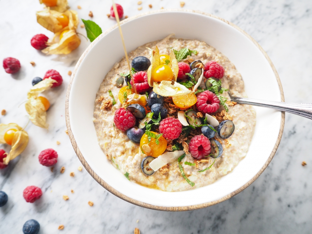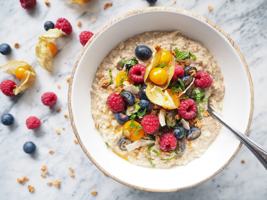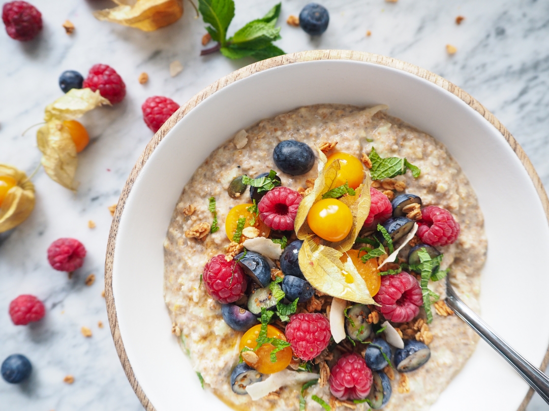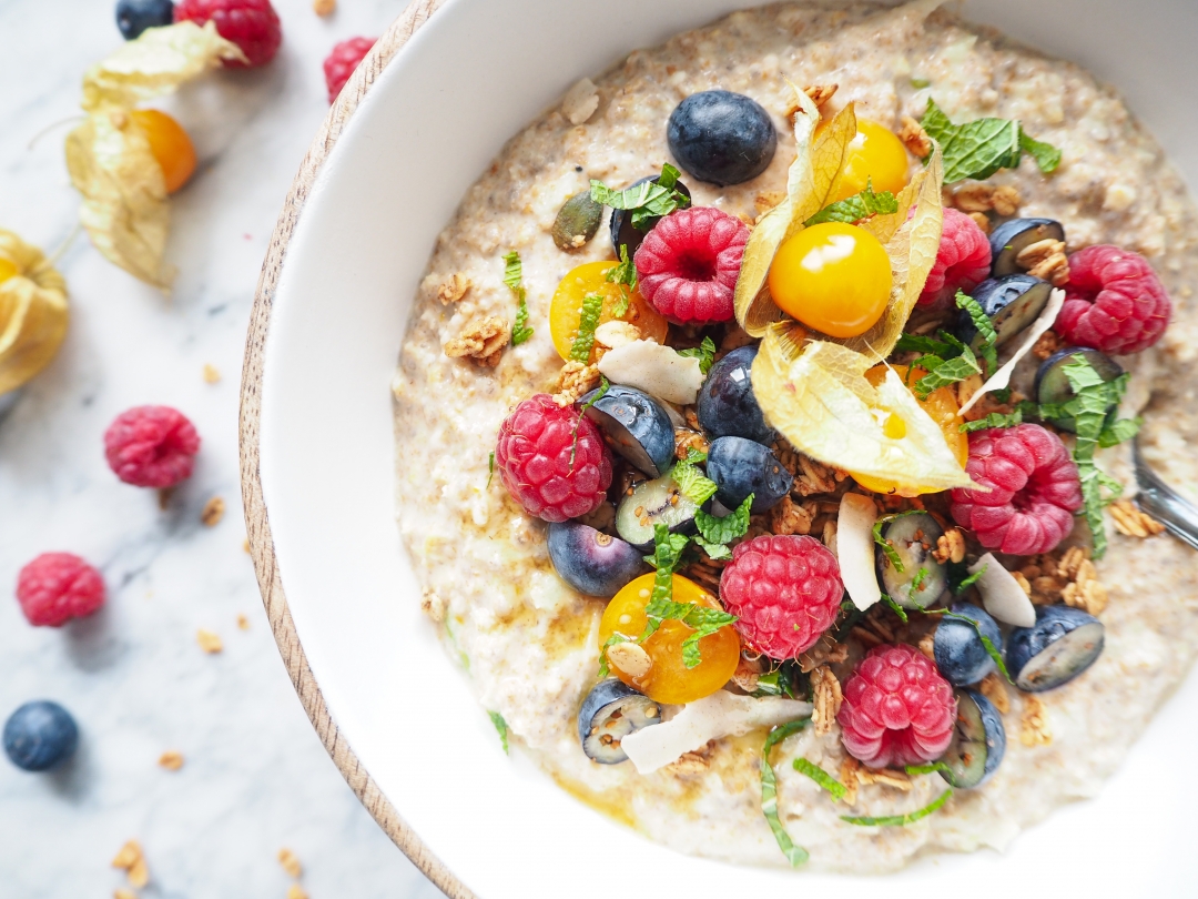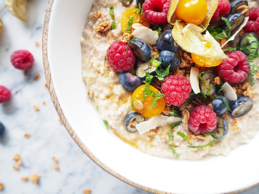 Na závěr jsem kaši dozdobila ovocem, granolou a čerstvě nasekanou mátou.