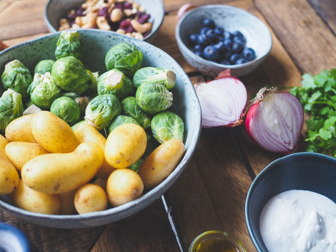 Začala jsem tím, že jsem předehřála troubu na 180 stupňů a připravila si zeleninu k pečení. Brambory jsem omyla a rozkrájela na poloviny nebo čtvrtiny – záleží na velikosti brambory. Kapustičky jsem očistila od zvadlých nebo žlutých lístků, pokud nějaký jsou, případně odkrajuju větší nebo nehezký košťály (ty menší nechávám, kapustičky pak hezky drží) a rozkrájela jsem je na poloviny. V míse jsem smíchala brambory, kapustičky, med, olivový olej, sůl, pepř, promíchala jsem, přemístila do pekáče a dala do trouby péct na cca 30 minut doměkka a dozlatova.